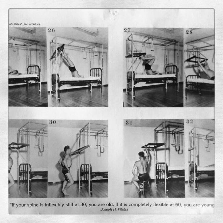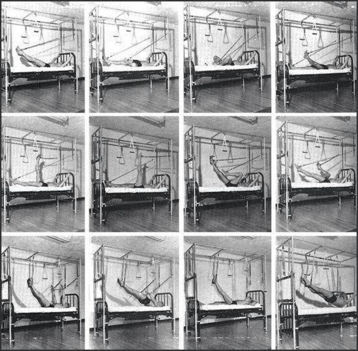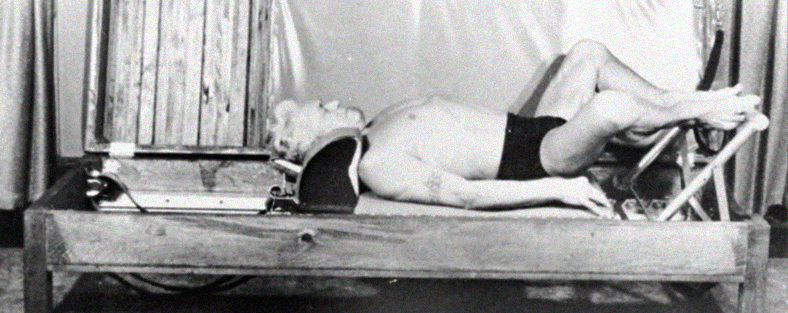 « tout changea pour le jeune gymnaste en août 1914. Il fut alors enfermé sur l’Île de Man, sous le nom de Pilatus. Pendant plus de trois ans, il s’afféra à développer sa méthode de gymnastique (C’est là qu’il mit au point la première machine de pilates studio, le Reformer. Il utilisa des lits de patients, des sangles et des ressorts, afin de soulager les corps et esprits de ses co-détenus. A la fin de la guerre, il décida donc de mettre à profit ce temps passé à étudier sur l’île de Man. Il ouvrit alors son premier studio Pilates avec les machines qu’il avait inventé. » Source